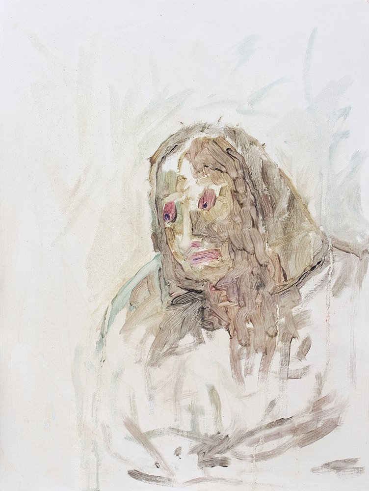 Good Morning (after Van Gogh’s Mother), 2016, Oil on hardboard, yarn, 10 x 12 in.